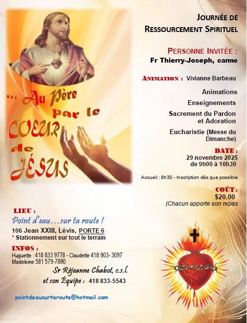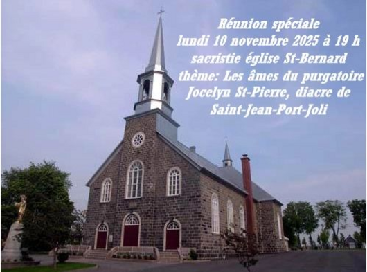 À une réunion spéciale le 10 novembre 2025, à la sacristie, sous le thème : Les âmes du purgatoire, avec le diacre Jocelyn St-Pierre de Saint-Jean-Port-Joli. Ceci sera une suite de la réunion du 29 septembre.