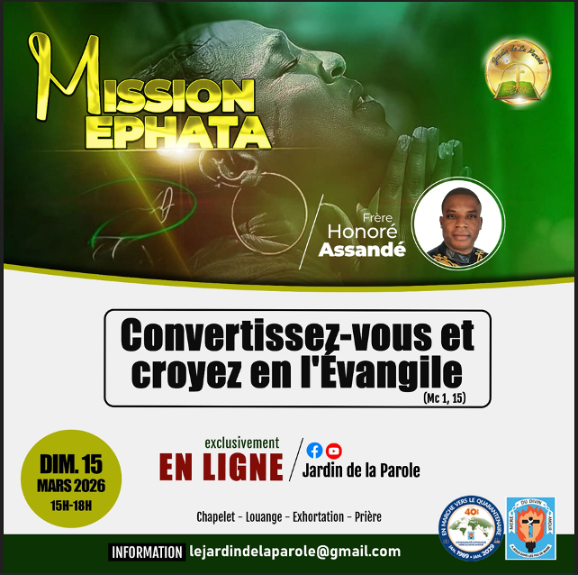 La communauté catholique Mère du Divin Amour vous informe que la prochaine Mission Ephata, prévue le dimanche 15 mars 2026, se déroulera EN LIGNE, contrairement à ce qui avait été annoncé initialement.🙏 Nous vous invitons à vous connecter à nos pages Facebook et YouTube afin de vivre ce moment de grâce avec nous.