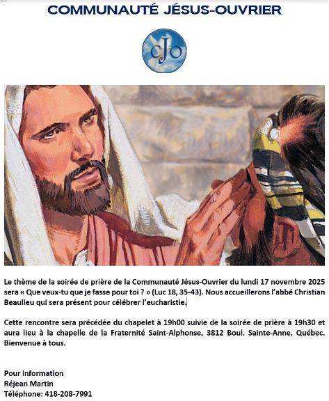 Le CCNN invite la population de Québec et des environs à une rencontre charismatique, le vendredi 14 novembre 2025 à 19h30, pour un « Partage de la Parole du jour » au sous-sol de l’église Ste-Ursule (salle Hamelin), au 3431, boulevard Neilson, Québec G1W 2W2. Entrée par le stationnement à l’arrière de l’église.